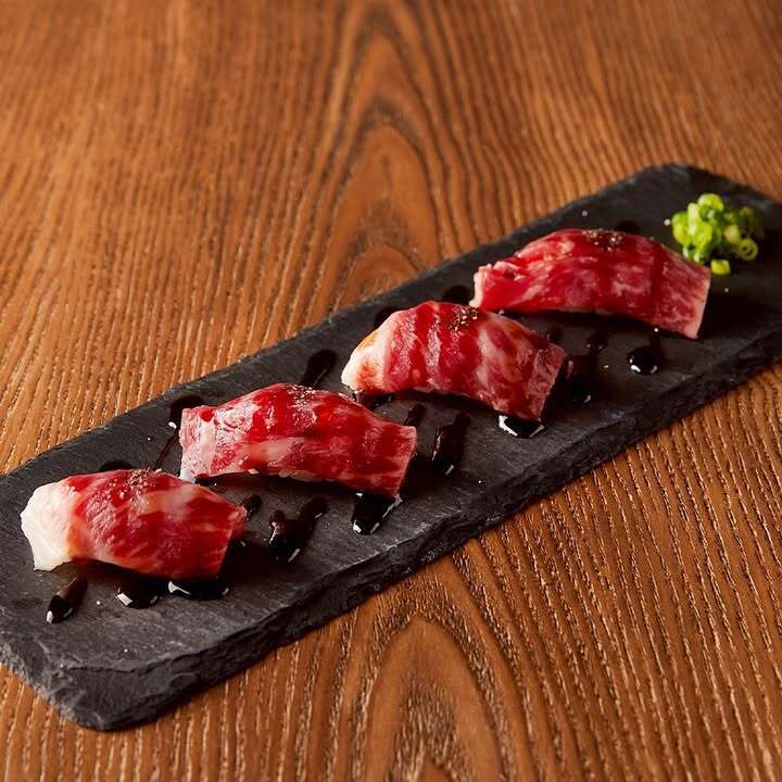 なお、通常一皿4貫でのご提供ですが、「肉寿司1貫 ¥380」で追加可能です。