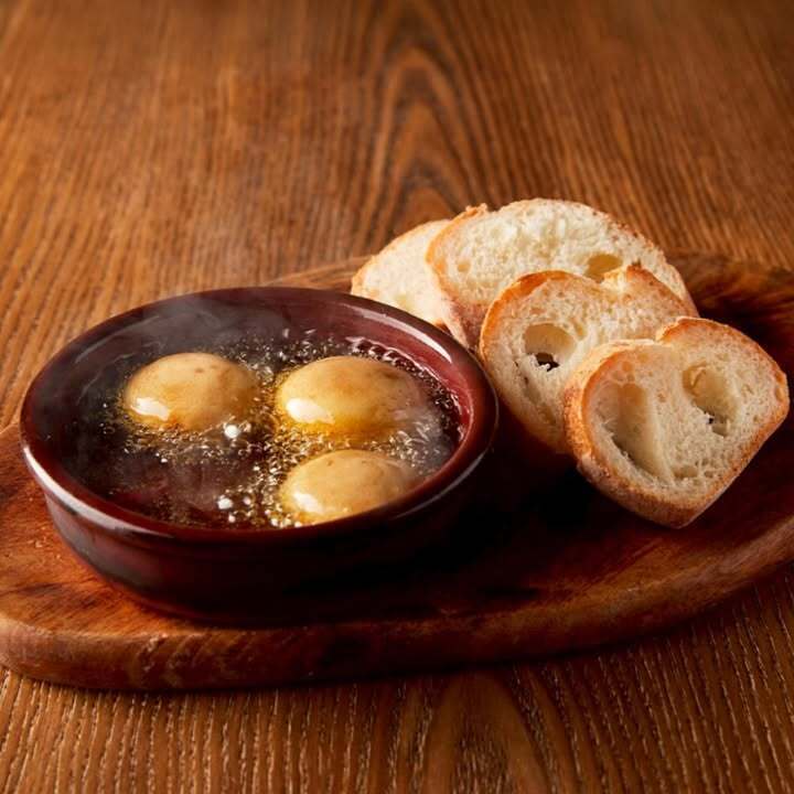 フライパンを火から取り上げて直ぐのご提供なので、グツグツ状態でお席までお運びします🙇♀️火傷にはご注意です🥵!バケット付きで、一皿4つのっています。