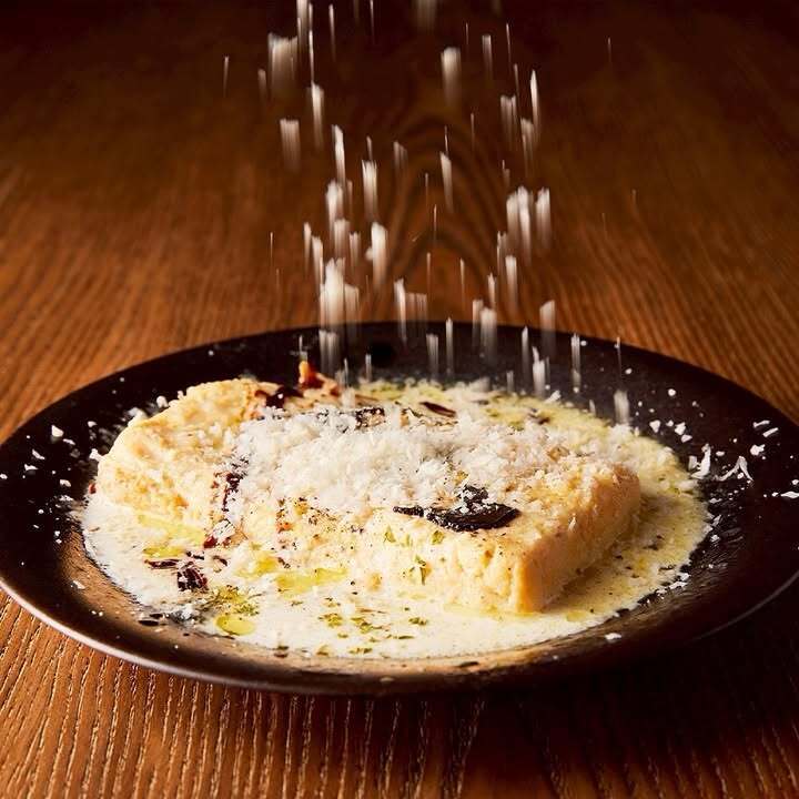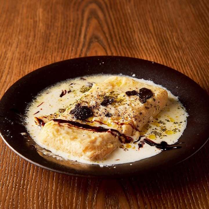 卵をたっぷり使用して、厚めに巻かれただし巻き玉子にクリームソースをかけてまろやかに仕上げました。より香りを楽しんでいただくため、トリュフとチーズを提供直前に削っています!バルサミコソースとの相性も抜群です⭐️ぜひ、ご賞味ください。