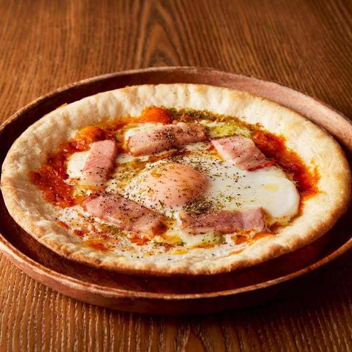 卵を割るときのワクワクする気持ち…分かりますか!?🤤(笑)トマトソース、チーズ、ベーコンがのっています。オーブンでじっくり焼き上げ、取り出したらすぐにご提供しているため、耳はパリパリです🎶お好みの大きさにカットしてくださいね〜!ぜひ、ご賞味ください。